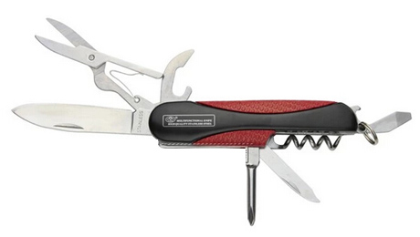 產品參數: 規格:94X25X18mm 重量:78.2g 材質:膠料+2Cr13不銹鋼+430不銹鋼 功能:1、開罐器 2、剪刀 3、大刀 4、十字螺絲刀 5、指甲銼(指甲除垢器) 6、螺旋開瓶器7、開瓶器(一字螺絲刀) 8、匙圈