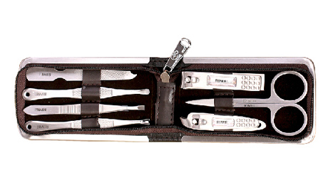 包裝規(guī)格:102mm*61mm*24mm 單套重量:108.8g 材質:PU+430不銹鋼 配件:RMT625E指甲鉗、美容剪、斜口指甲鉗、指甲銼、耳挖、死皮刀、眉夾